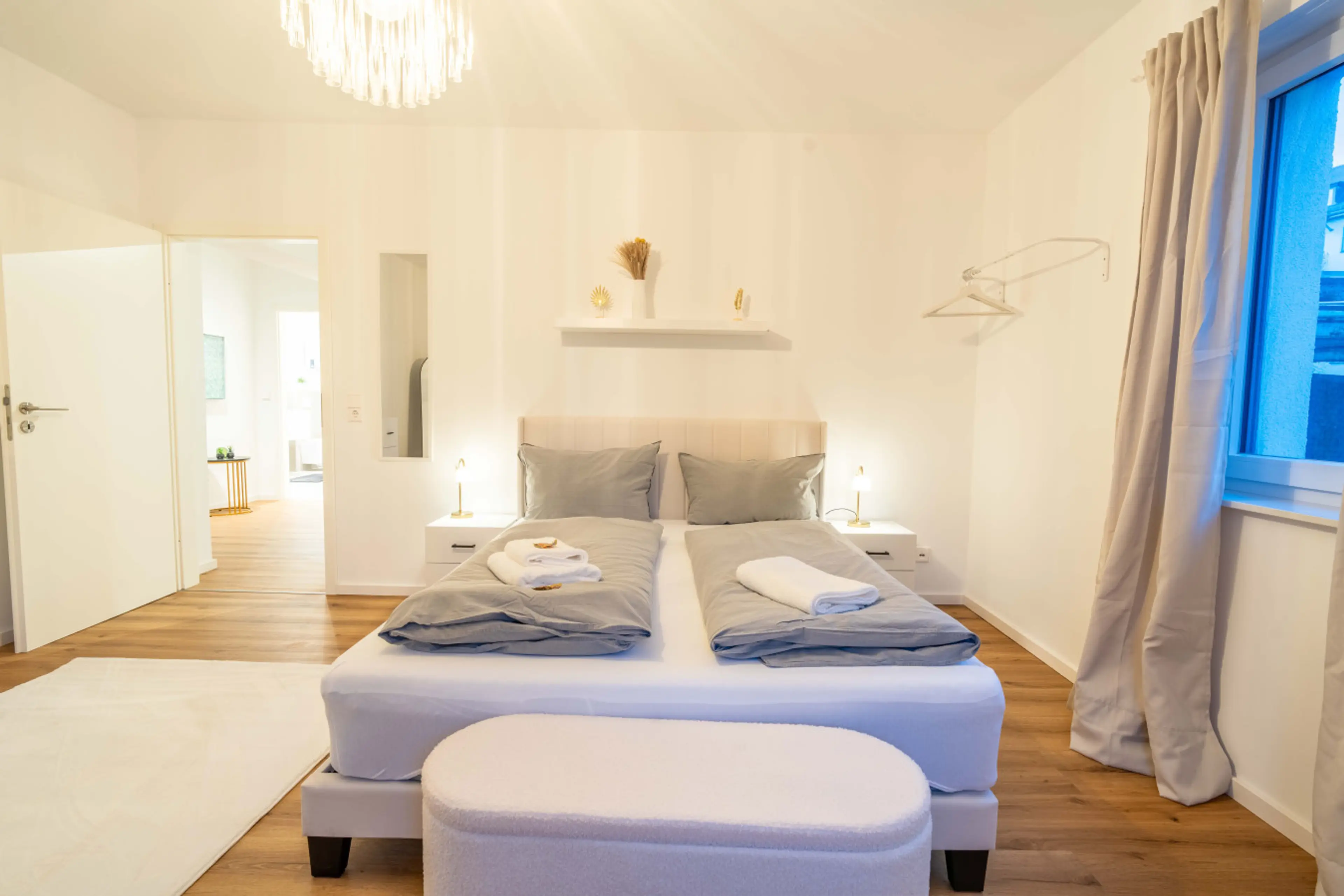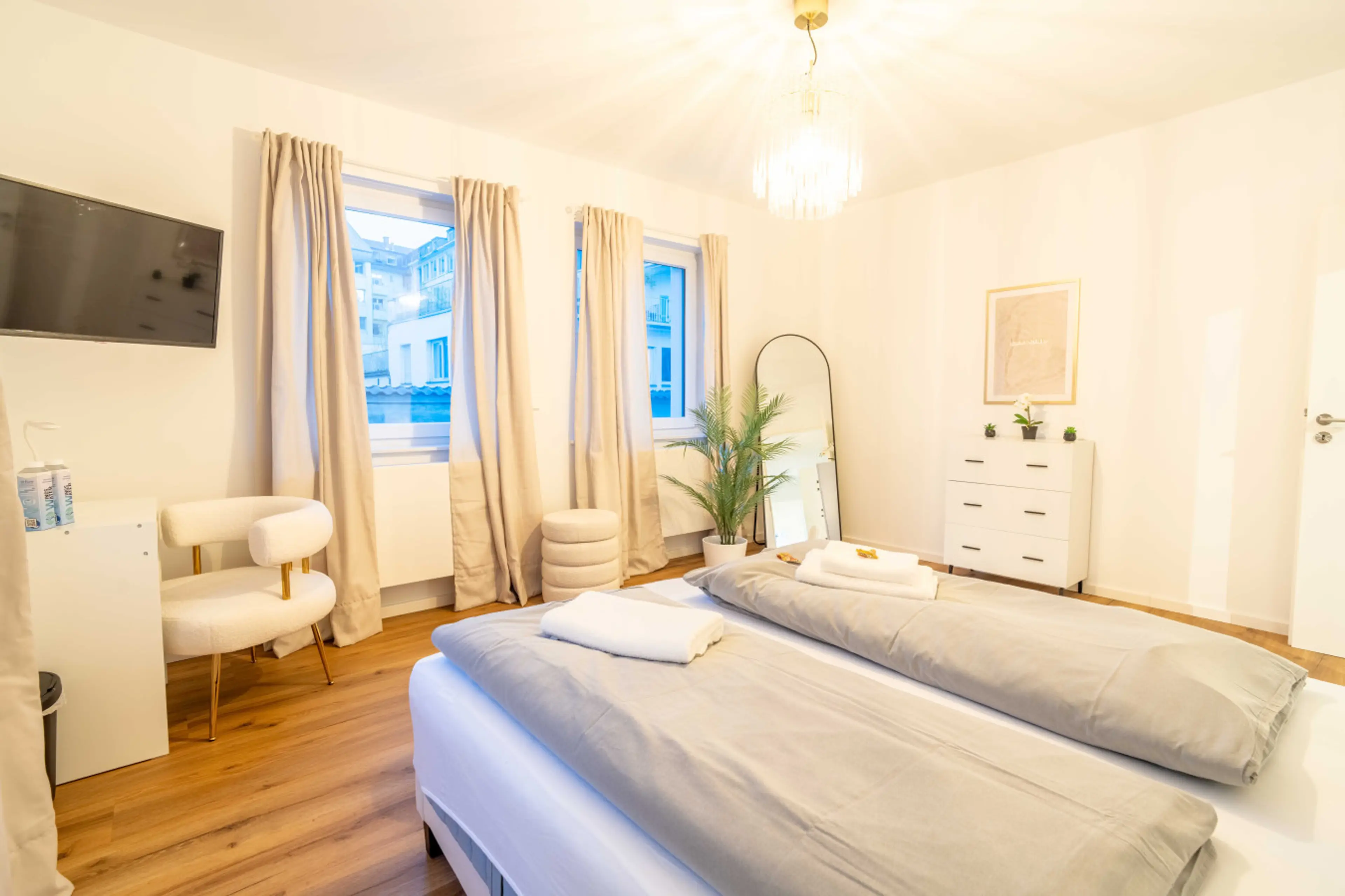 Dieses stilvoll eingerichtete Apartment vereint modernes Design mit Gemütlichkeit. Das helle Wohnzimmer mit großem Sofa und TV mit Sky lädt zum Entspannen ein. Am runden Esstisch finden vier Personen bequem Platz. Das Schlafzimmer bietet ein komfortables Doppelbett, sanfte Farben und viel Licht. Das...